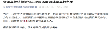 据悉,全国高校法律援助志愿服务联盟由中国政法大学、北京大学、武汉大学、中山大学、华东政法大学、西南政法大学、西北政法大学、哈尔滨商业大学8所高校牵头发起成立,旨在搭建跨区域协同平台,聚合教育资源、专业资源与社会资源,共同推进法律援助事业高质量发展。联盟秘书处设在中国政法大学。目前,全国高校法律援助志愿服务联盟共吸纳了161所高校参与。