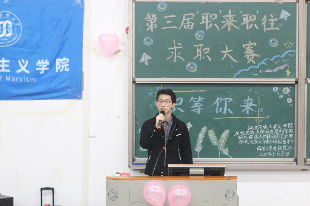 本网讯(记者 袁本怡 见习记者 邹跃宁)11月8日,我院联合马克思主义学院、教师教育学院、林学园艺学院于修远楼5A207举办以“妙选职场之道,绘就锦绣前程”为主题的第三届“职”来“职”往求职大赛决赛。我院团总支书记谢学婧、马克思主义学院教师王红卓、教师教育学院团总支书记李志刚、林学园艺学院团总支副书记邹丽荟出席并担任评委。