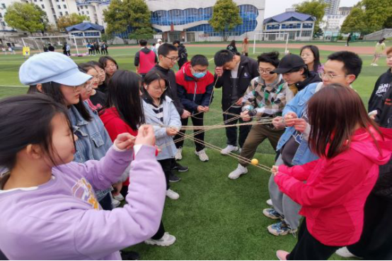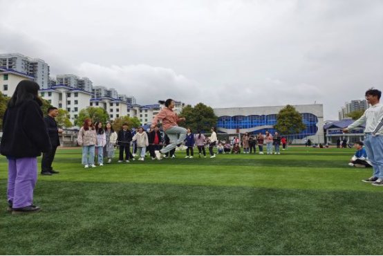 我院党总支副书记许宗友,学生科科长胡海剑到场为学生们加油。许宗友表示:“举办此次活动的目的是为了让同学们在运动中学会团结协作,从而造就更好的班集体。”而后,他也同学生们一起参与“跳大绳”游戏,并传授游戏技巧。赛场上一片欢声笑语,学生们三五成群,脸上洋溢着开心的笑