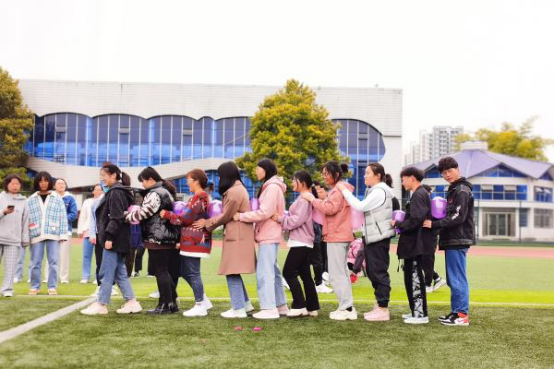 班级熟悉规则后依次开展不同的游戏活动。在“男生女生向前冲”赛区,十名学生排成一列依次夹着气球喊着“一二一”的口号向前进,气球落地又立刻回到起点重新开始,在班级学生的共同努力下,队伍顺利到达终点,学生抱成一团,相互鼓励纵横天下两人三足跳大绳赛区也分外热闹,学生们互相加油鼓劲抵达终点。