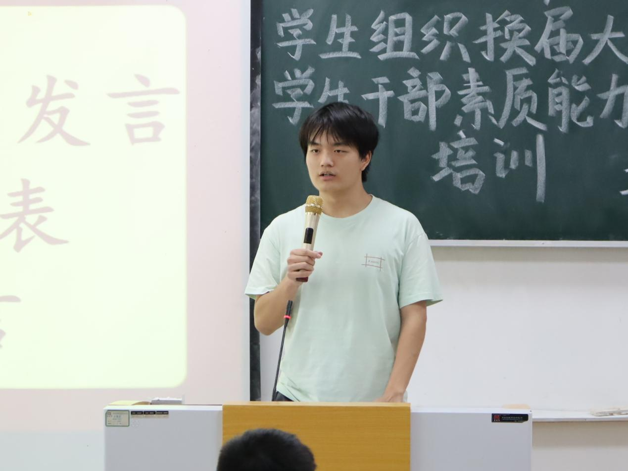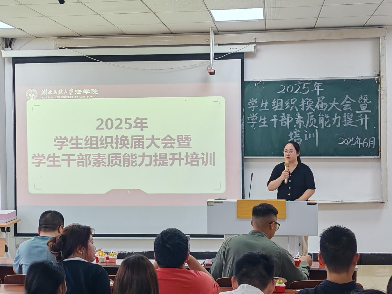本网讯(记者 曾钰格/文 李佳萱/图)2025年6月15日,我院于德智楼9B301教室举办2025年学生组织换届大会暨学生干部素质能力提升培训。此次大会由我院团委书记谢学婧主持,我院党总支副书记黄晓波、学生党支部书记彭阳出席,100余名学生干部参加。