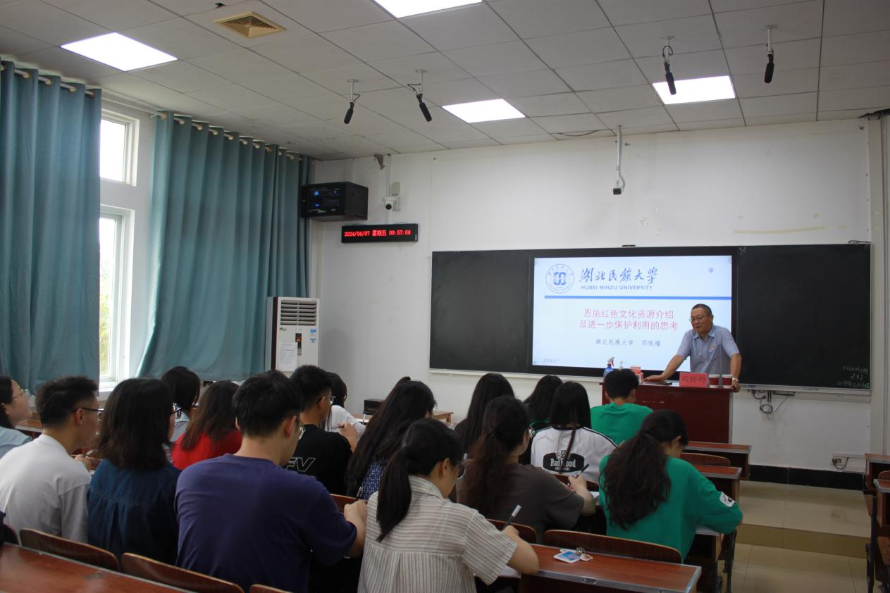 邓辉煌同志围绕“恩施红色文化”为主题,分别从“恩施红色文化资源丰富”“恩施地区红色资源保护、利用工作中存在的问题”以及“进一步保护和利用恩施红色文化资源的思考”三个方面进行介绍。邓辉煌同志着重从土地革命时期、抗日战争时期、解放战争时期和社会主义建设和改革开放时期四个时期对恩施红色文化历史进行了介绍。他强调大家在关注恩施民族文化与生态文化的同时,更应重视恩施红色文化的保护和利用,并呼吁同学们亲身前往恩施红色革命地学习和思考关于恩施红色文化的精神。