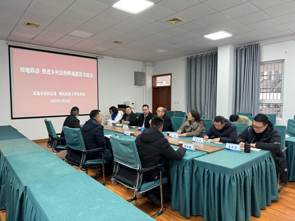 2月19日,恩施市委常委、政法委书记李华军,恩施市司法局副局长向成义、恩施市委政法委政治处主任龚清新一行莅临我院开展“校地联动推进乡村法治阵地建设交流活动。学校党委常委、纪委书记张宏磊,学校党委委员、研究生部(处)部(处)长、学科建设与学位管理办公室主任汪燕学院党总支书记张明波副院长李文革党总支副书记黄晓波,副院长蔡世鄂,知识产权研究中心主任杨信等参加了本次交流活动。