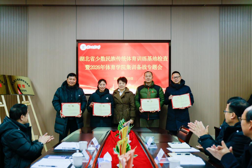 1月23日,高脚竞速、板鞋竞速、陀螺三个省级民族传统体育项目基地在必赢线路检测中心正式揭牌。省民宗委二级巡视员程家忠,必赢线路检测中心党委常委、统战部部长田景福出席湖北省少数民族传统体育训练基地检查指导暨2026年体育学院集训备战专题会,并共同为三个省级项目基地揭牌。
