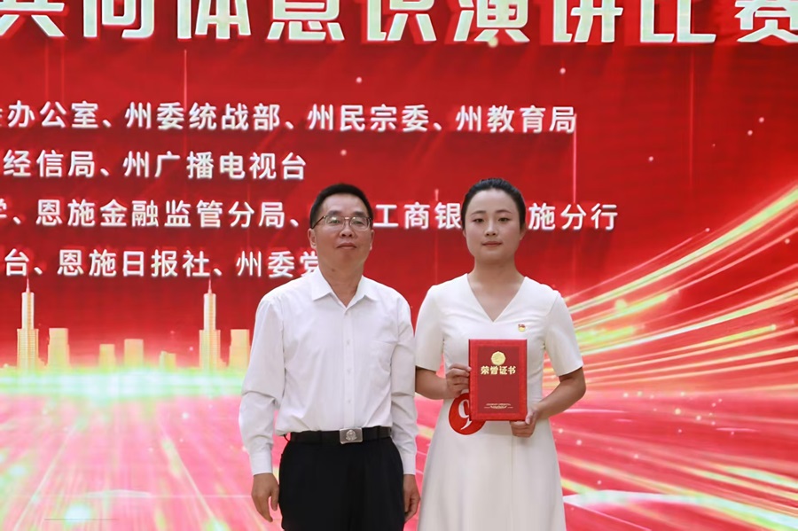 为深入学习贯彻习近平总书记关于加强和改进民族工作的重要思想,全面落实习近平总书记考察湖北重要讲话精神,推进铸牢中华民族共同体意识教育走深走实,我校积极组织师生参加恩施州举办的2025年“工行杯”铸牢中华民族共同体意识主题演讲比赛,分别获得教师组别赛、学生组别赛一等奖。