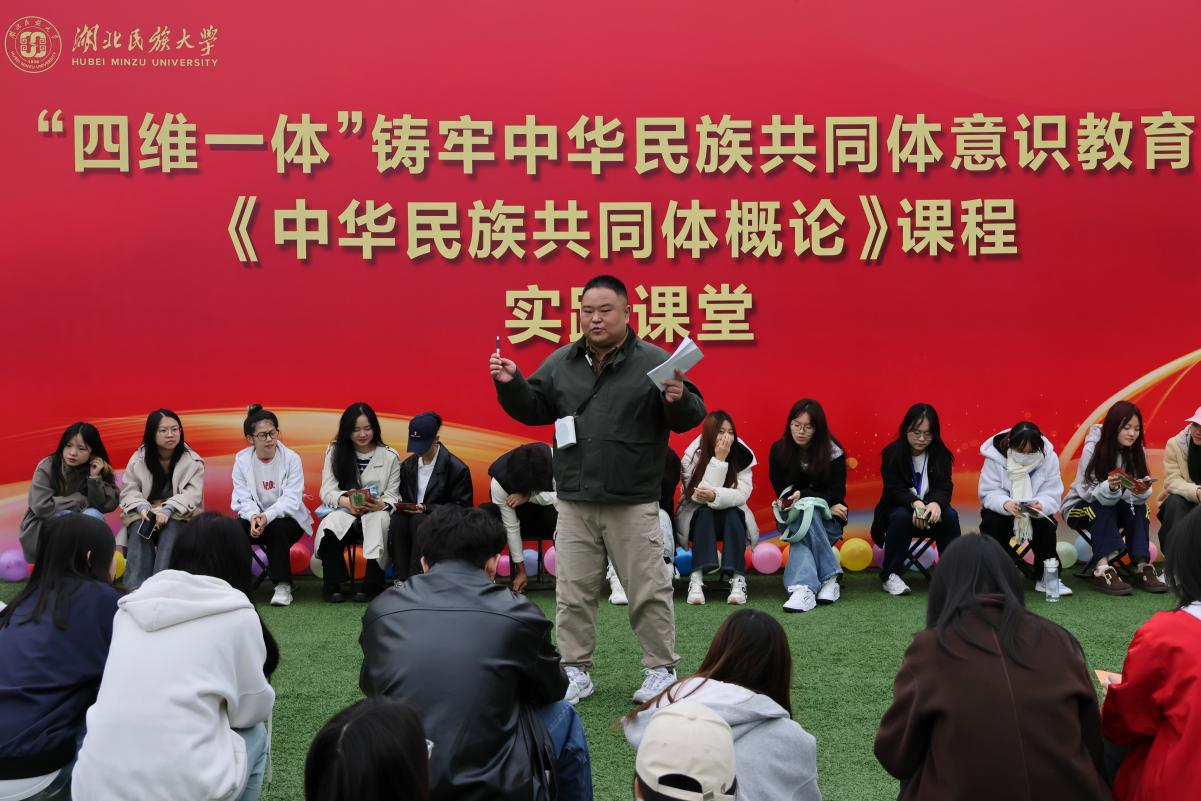 在主题教育与知识竞答现场,“红石榴知识挑战赛”进行得如火如荼,同学们通过摘取纸条回答问题,积极参与知识竞赛。在实践课堂区域,学生围坐一团,聆听老师现场讲授《中华民族共同体概论》课程。