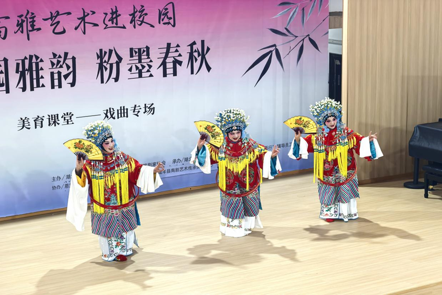 晚会在古朴神秘的傩舞《傩祈万福》中拉开帷幕。随后,巴东堂戏《山伯访友》选段“十八相送”率先登场,国家级代表性传承人谭文署、邓胜兰等老艺术家以地道声腔,将梁山伯与祝英台的依依惜别表现得淋漓尽致,赢得满堂喝彩。由我校戏曲团创排的流行戏腔《武家坡》则以青春律动激活传统基因,实现戏曲与时代的“双向奔赴”。京剧《贵妃醉酒》由恩施州戏剧家协会蹇平、刘利恩、陶婉玲联袂献演。一句“海岛冰轮初转腾”出口,花衫旋转、衔杯下腰,把杨贵妃的孤寂与傲然唱到极致,满厅酒香仿佛扑面而来。南剧《斩韩信》、灯戏《雪山放羊》、京剧《野猪林》、柳子戏《同结相思扣》等经典选段轮番亮相,或雍容华贵,或俏皮灵动,或慷慨悲壮,尽显“国粹”风采。《大唐贵妃》主题曲《梨花颂》旋律响起,国家一级演员黄丽芬老师深情献唱,将李杨爱情的家国情怀化作绕梁之音。戏曲串烧《京黄和鸣》把整场晚会推向高潮。京剧《锁麟囊》《卖水》、黄梅戏《女驸马》《天仙配》、京歌《说唱脸谱》五段连缀,青春的脸庞与古老的行当交相辉映,传统基因在00后身上焕发出崭新光芒。一曲终了,全场起立鼓掌,叫好声经久不息。