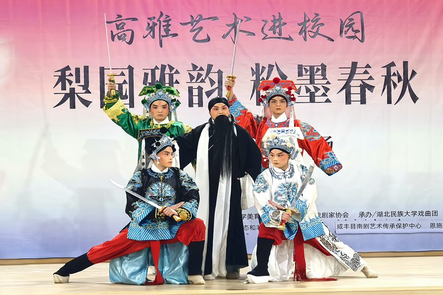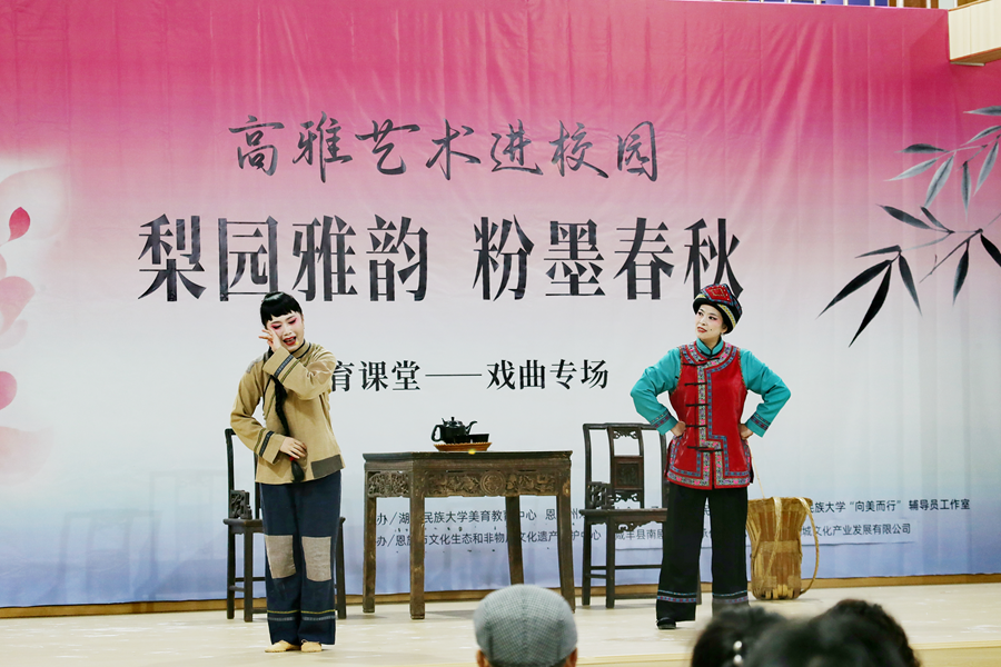12月18日晚,由我校美育教育中心、恩施州戏剧家协会联合主办,必赢线路检测中心戏曲团、必赢线路检测中心“向美而行”辅导员工作室承办,恩施市文化生态和非物质文化遗产保护中心、咸丰县南剧团协办的“高雅艺术进校园——梨园雅韵·粉墨春秋”戏曲专场晚会,在必赢线路检测中心音乐舞蹈学院一楼大厅精彩上演。