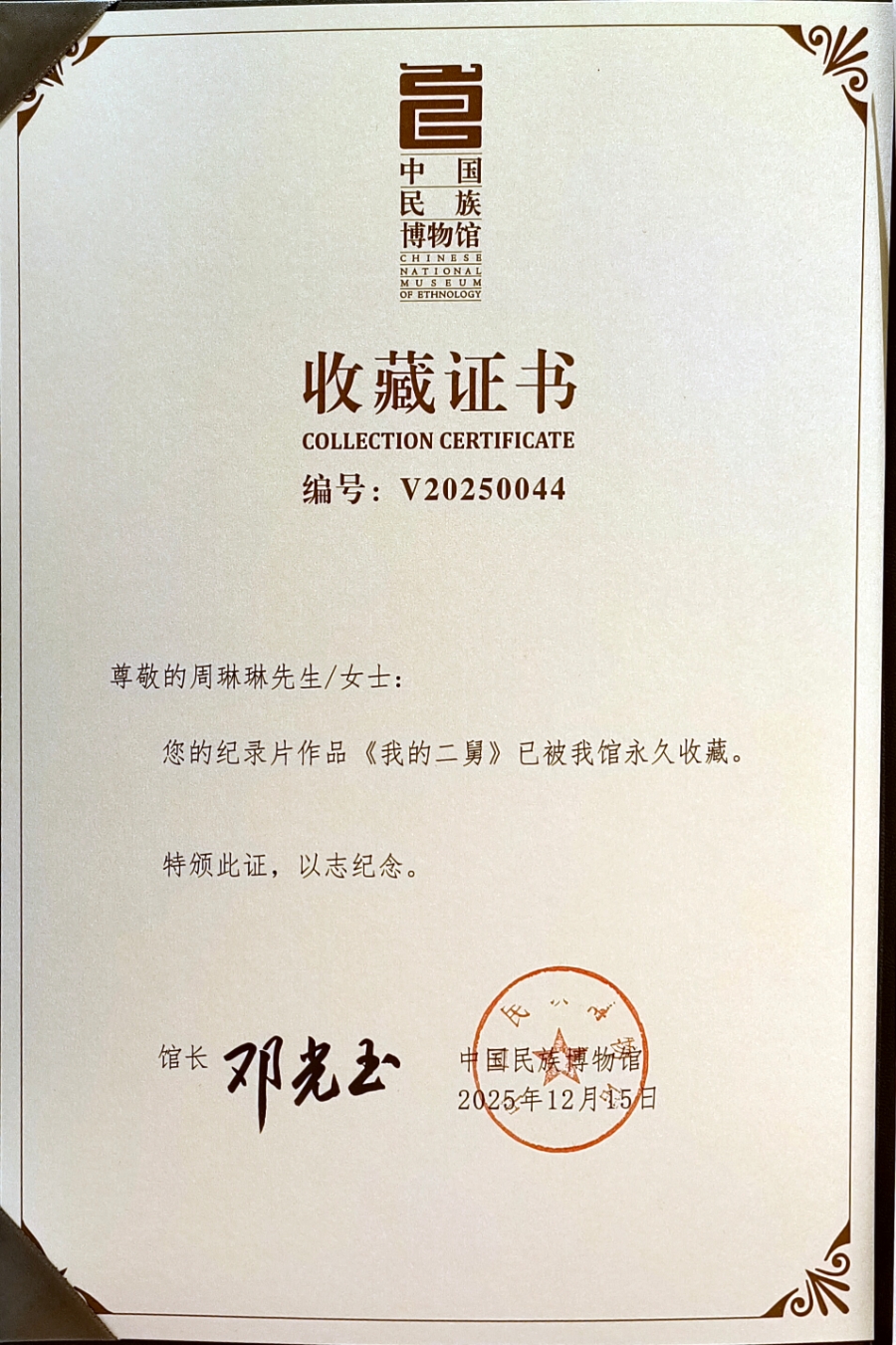 纪录片《我的二舅》收藏证书