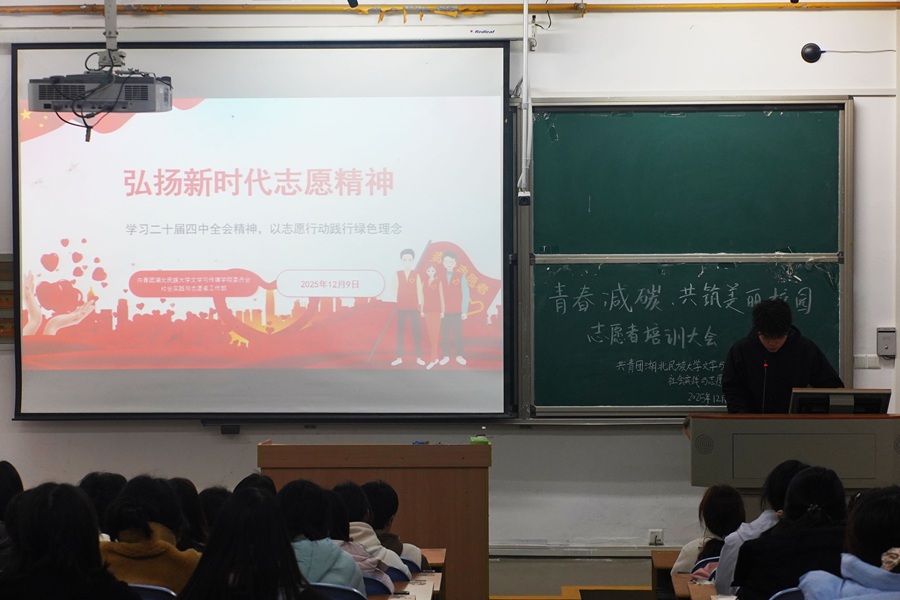 12月9日,共青团必赢线路检测中心文学与传媒学院委员会社会实践与志愿者工作部在修远楼5A101教室开展以“青春减碳·共筑美丽校园”为主题的志愿者培训。“铸魂育人”志愿理论宣讲活动部分,社会实践与志愿者工作部干事汪子钧围绕思想引领、绿色行动、实践路径三部分讲述志愿精神的时代内涵,鼓励青年志愿者积极参与志愿服务。宋正悦作分享“榜样引领”志愿故事分享会部分,2024级五星级志愿者宋正悦结合自身服务经历分享志愿路上的“...