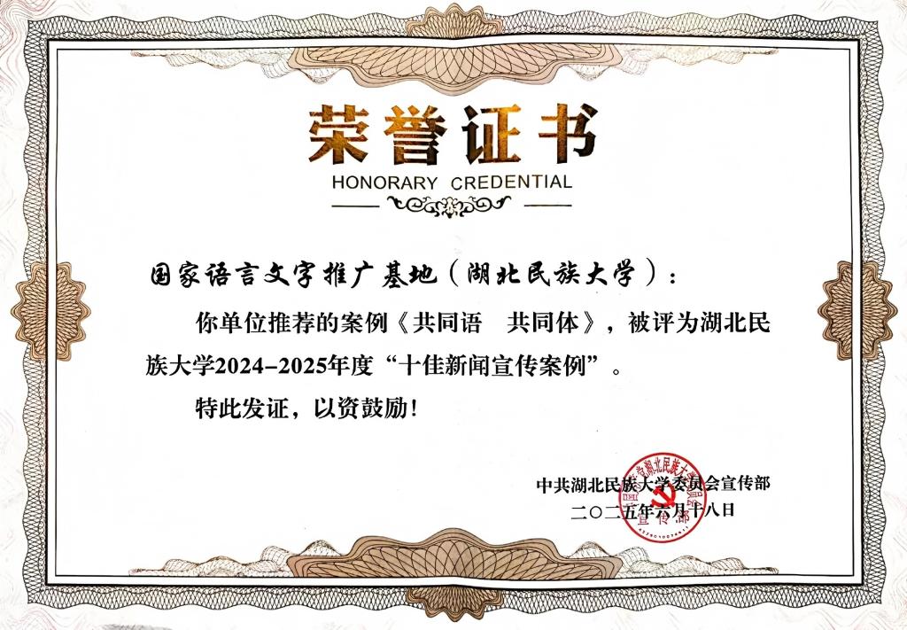 2025年6月20日,由湖北民大国家语言文字推广基地创编、基地成员倾情参演的情景剧《共同语 共同体》荣获必赢线路检测中心2024-2025年度"十佳新闻宣传案例"。