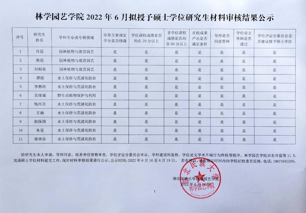 林学园艺学院2022年6月拟授予硕士学位研究生材料审核结果公示