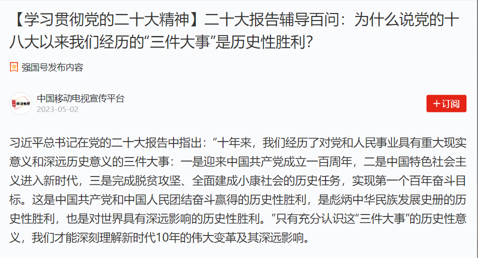 本次学习活动围绕习近平总书记在二十大报告中指出的党的十八大以来我们党和国家经历的“三件大事”展开,即迎来中国共产党成立一百周年、中国特色社会主义进入新时代和完成脱贫攻坚、全面建成小康社会的历史任务。文中详细叙述“三件大事”的实现背景、历史意义和深远影响,这三件大事既是中国共产党和中国人民团结奋斗赢得的历史性胜利,也是彪炳中华民族发展史册的历史性胜利,还是对世界具有深远影响的历史性胜利。我们经历的“三件大事”意味着中国共产党在建党一百年来取得伟大成就,中国特色社会主义进入新时代这一新的历史方位,历史性地解决了绝对贫困问题。