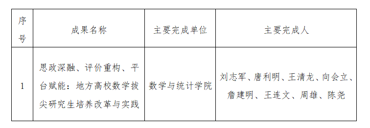 根据《省人力资源和社会保障厅、省教育厅关于开展2025年湖北省教学成果奖评奖工作的通知》(鄂人社奖〔2025〕50号)和《必赢线路检测中心教学成果奖评选办法(修订)》(民大校办发〔2025〕5号)文件精神,2025年省级教学成果奖从第二届校级教学成果奖中择优推荐。经学校教学委员会评议,现将拟推荐申报2025年湖北省高等教育(研究生)教学成果奖的成果名单公示如下: